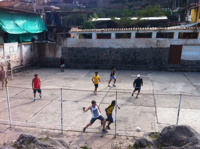 Last Friday, the first sunny afternoon there had been in Cusco since I had arrived, I bumped into some guys from my hostel at the Plaza del Armas. They had been chatting to some local artists, who sell traditional paintings to tourists around the city. The painters meet every Friday afternoon to play football for a few soles and a bit of fun, and had invited the guys from the hostel to play against them. I declined their offer to join team gringo, but happily agreed to go along and be the official photographer for the afternoon. After a short taxi ride up from the Plaza we arrived up at the football pitch, a small concrete yard nestled in the favela-style houses of the locals which sprawl up the hills above the city. The views from the spot made it a pretty special place for a casual game of footy.
