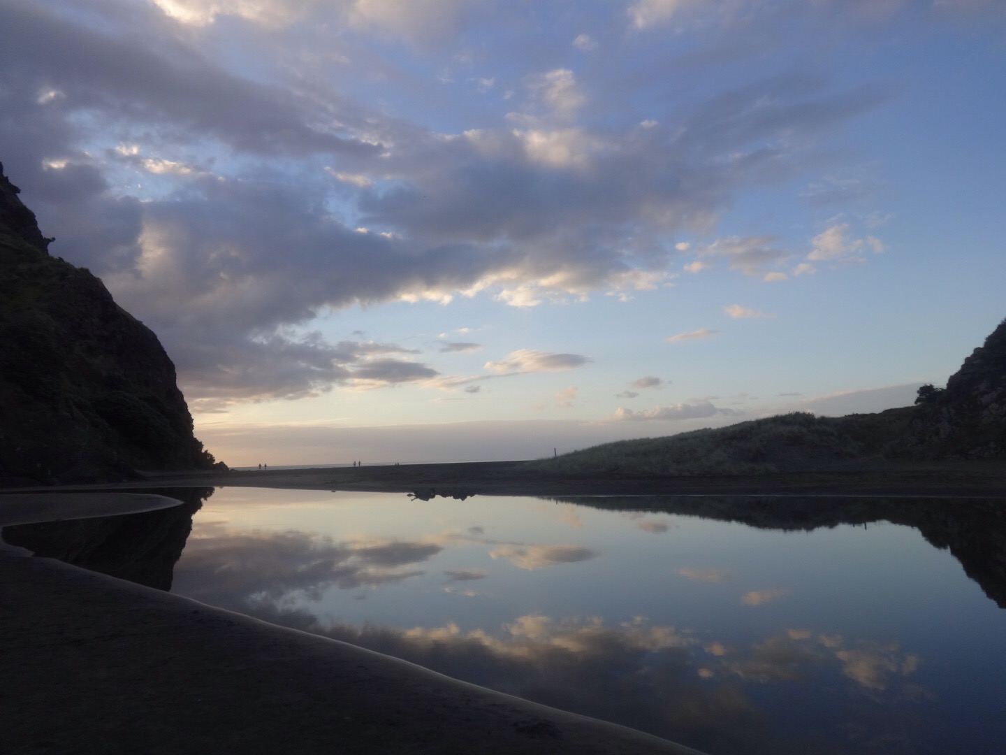 Once my lust for steps had been satisfied, I carried on to the beach, as the sunlight began to turn pinky-golden. Approaching the beach the sky was reflected perfectly in the creek which runs past Lion Rock to the sea.